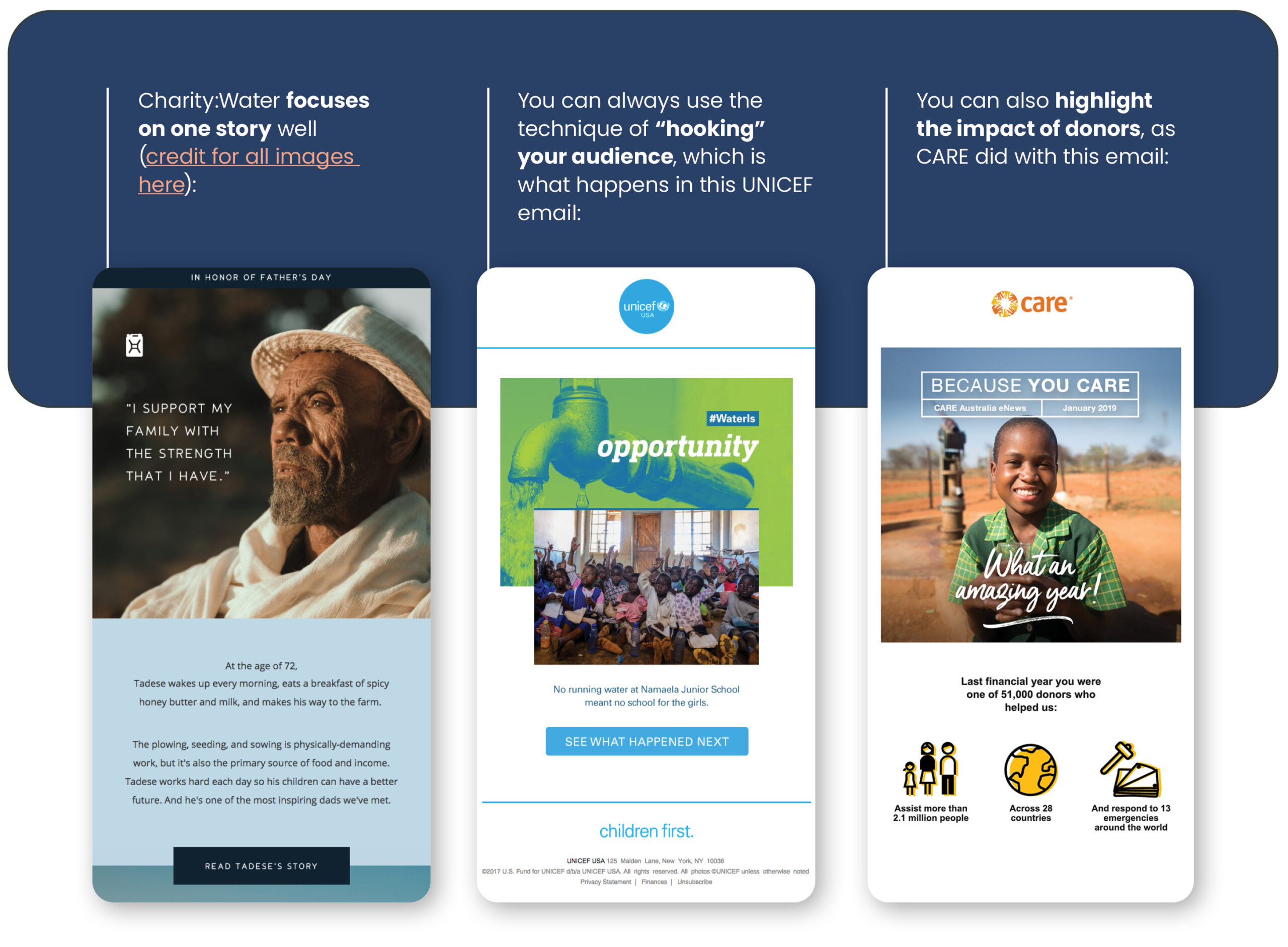 You can also highlight the impact of donors, as CARE did with this email.