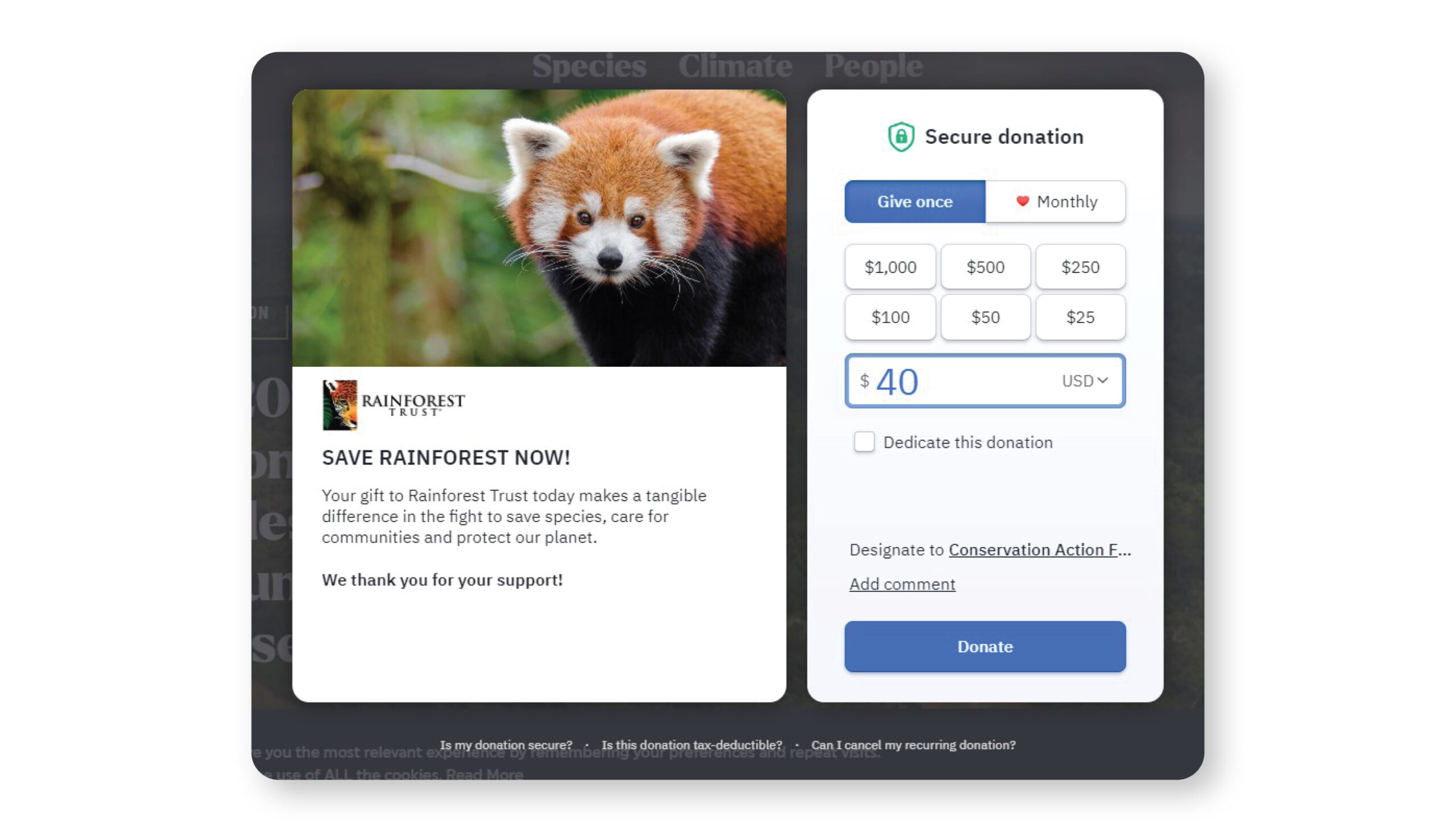 Rainforest Trust uses an effective technique, placing a lightbox to highlight its donation form. There's arresting imagery, the mission is included, it's easy to make the gift a recurring donation, and it's easy to dedicate the donation.